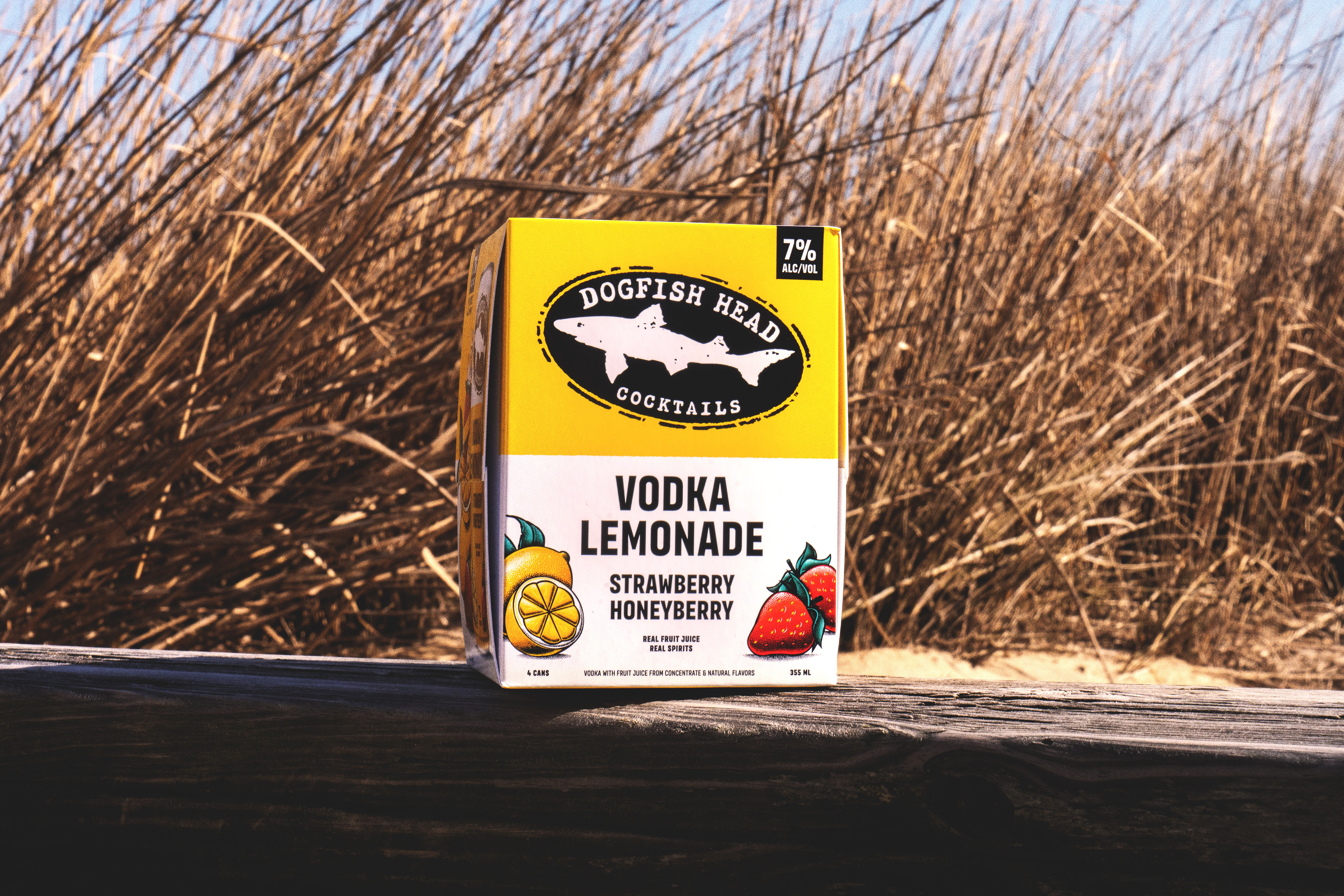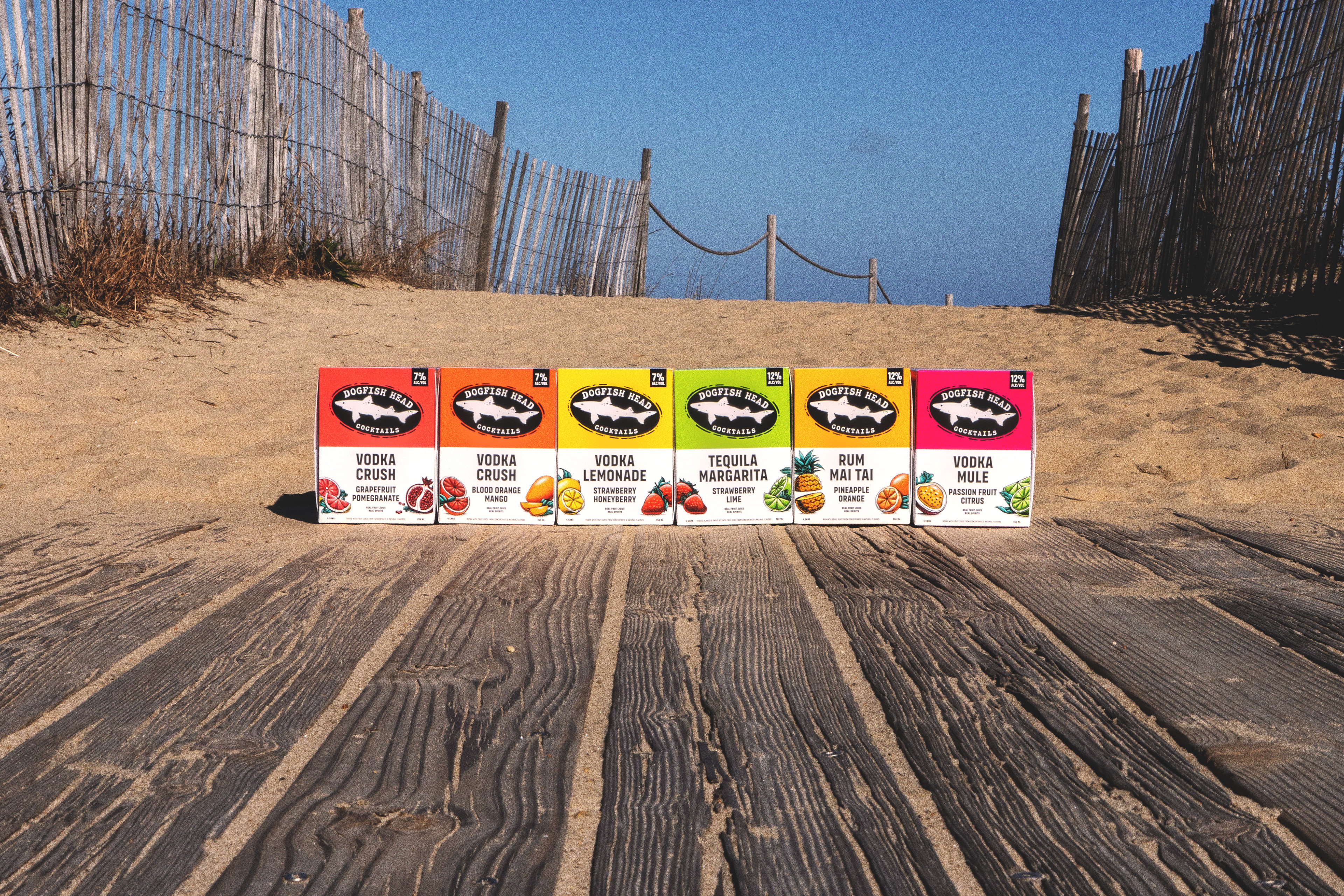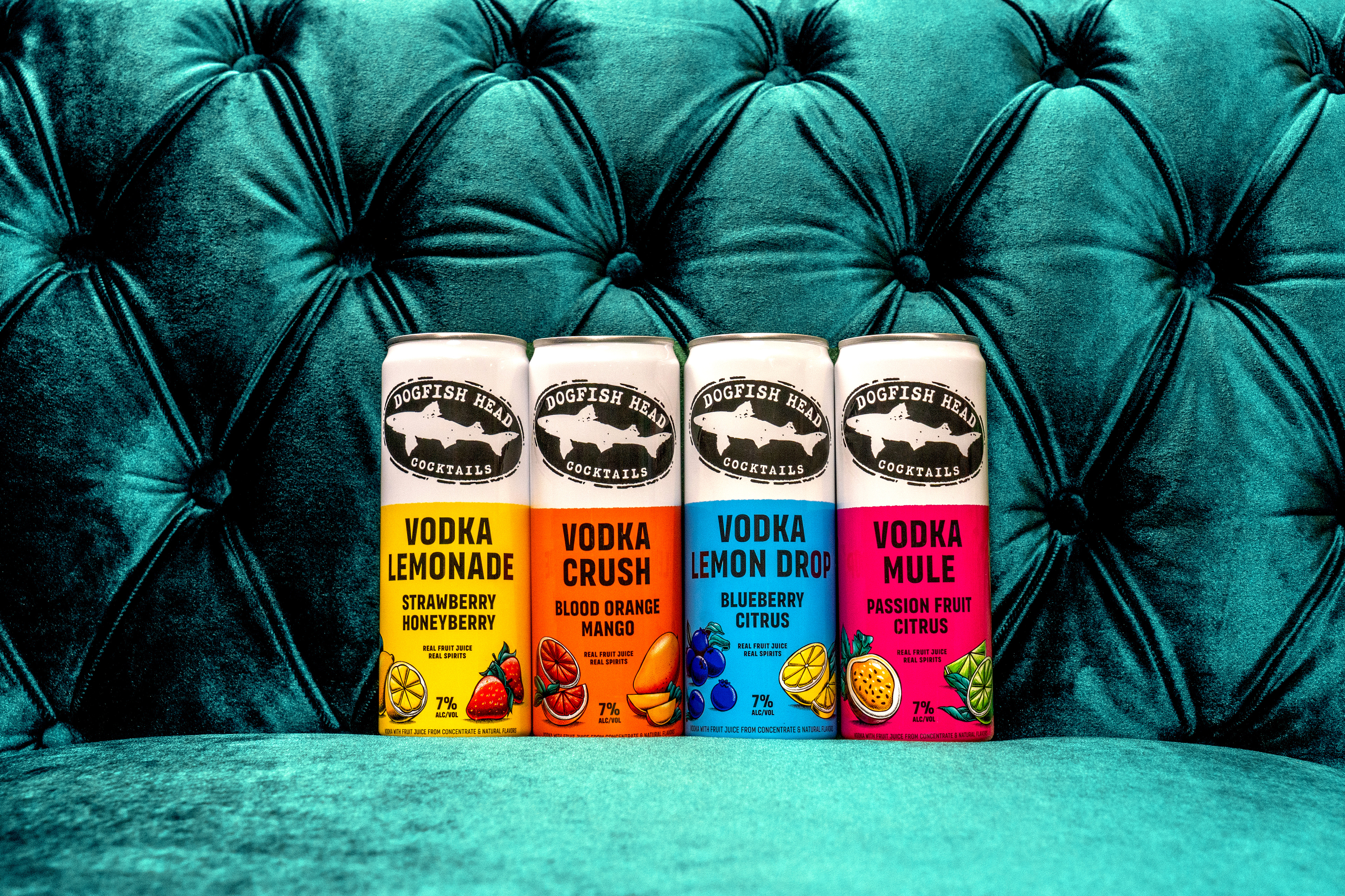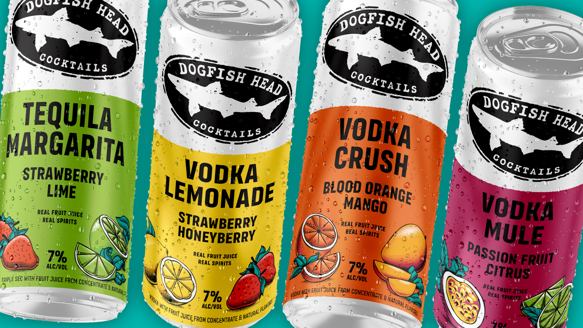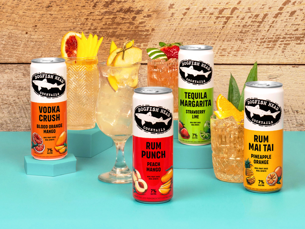 Refresh packaging design for Dogfish Head Cocktails to improve performance at shelf. Enhance brand visibility and increase clarity around product offering (cocktail vs. seltzer) while prioritizing emphasis on real distilled spirits and real fruit flavor.