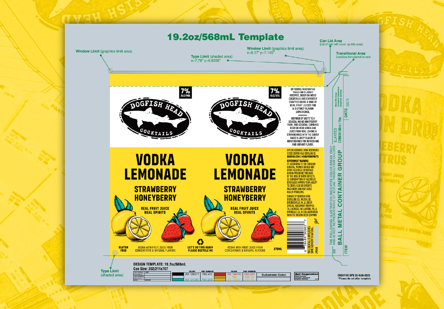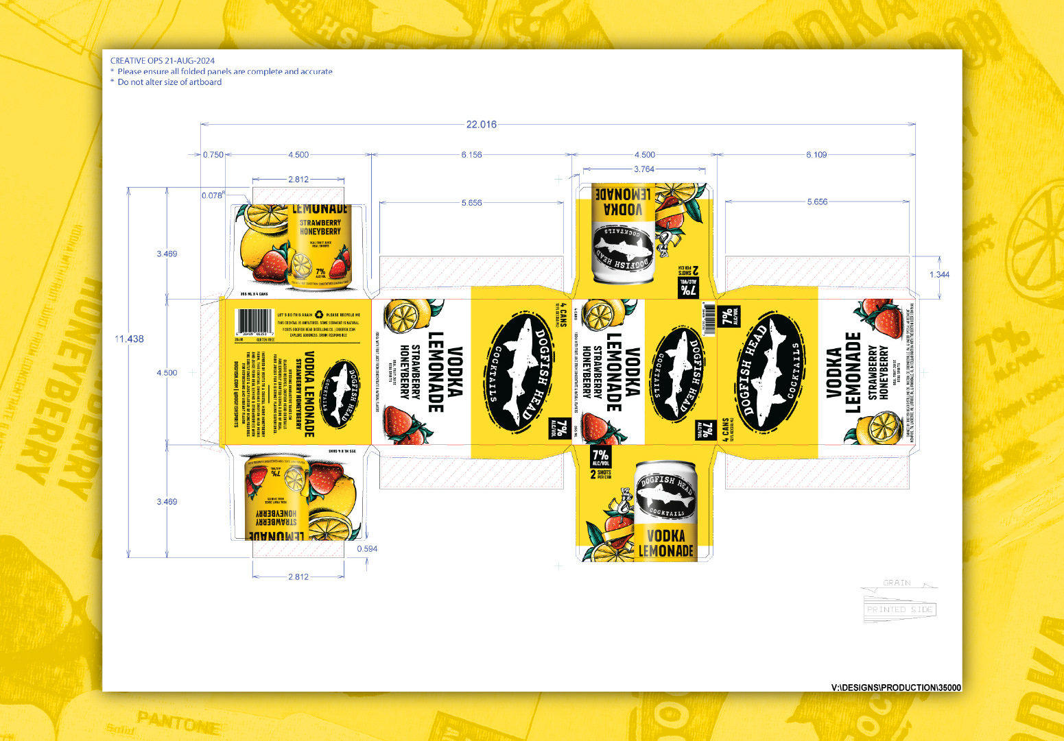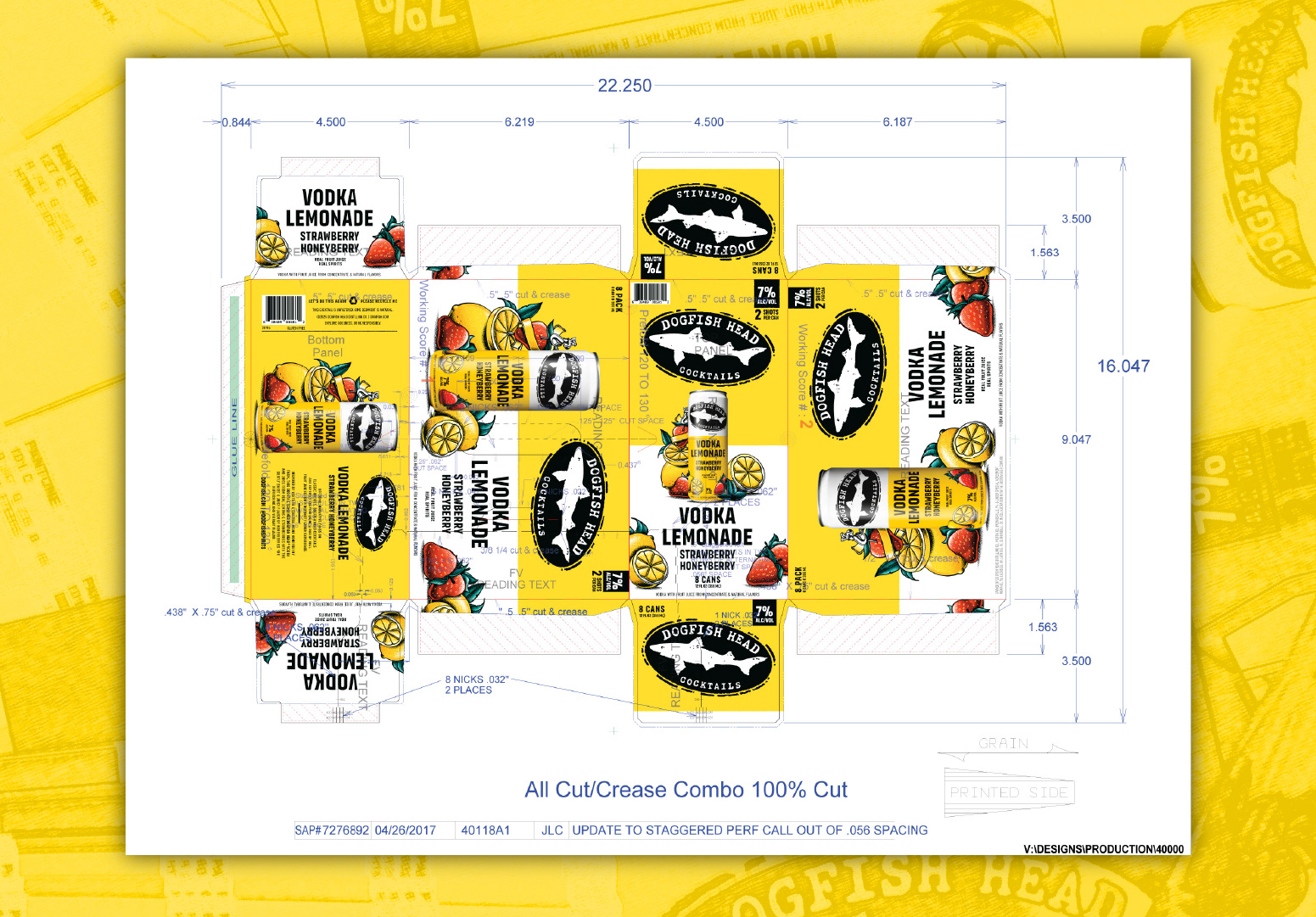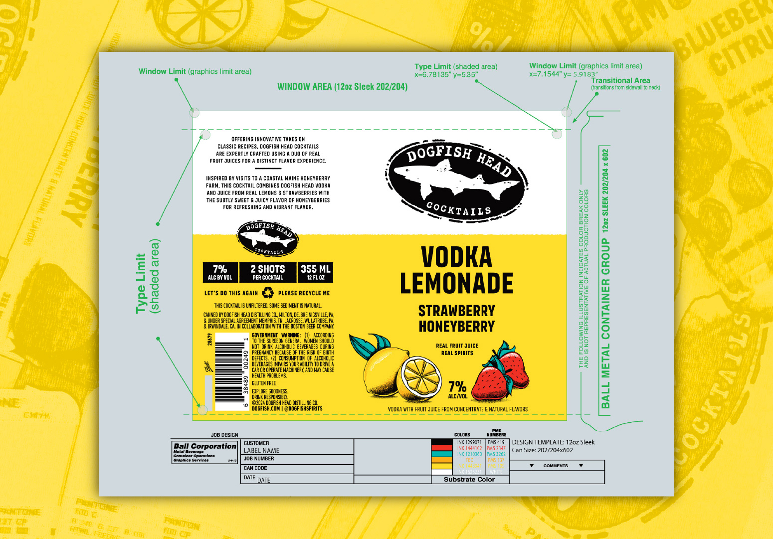 Refresh packaging design for Dogfish Head Cocktails to improve performance at shelf. Enhance brand visibility and increase clarity around product offering (cocktail vs. seltzer) while prioritizing emphasis on real distilled spirits and real fruit flavor.